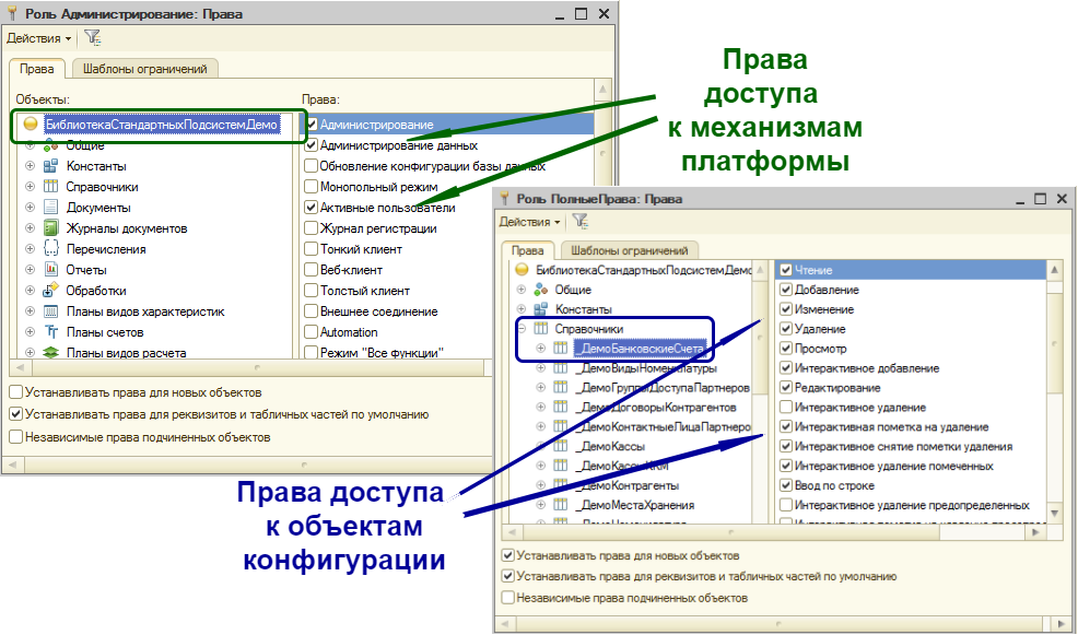 Количество видов прав доступа предопределено платформой. Всего платформе есть две основные группы прав доступа. Общие для всей системы права доступа к механизмам платформы, отвечающие за доступ к определенным режимам работы платформы (Администрирование, Монопольный режим, Тонкий клиент,Интерактивное открытие внешних отчетов…. ). И объектные права доступа, позволяющие работать с различными объектами конфигурации. Их количество зависит от типа объекта конфигурации. Например, у справочника есть 16 различных видов доступа (Чтение, Добавление, Изменение, Удаление….). Для регистра сведений видов доступа всего пять. Все эти права можно установить только на уровне справочника целиком. Также можно ограничить доступ на уровне реквизитов. Но в этом случае доступна лишь часть видов прав (для справочников это права Просмотр и Редактирование).