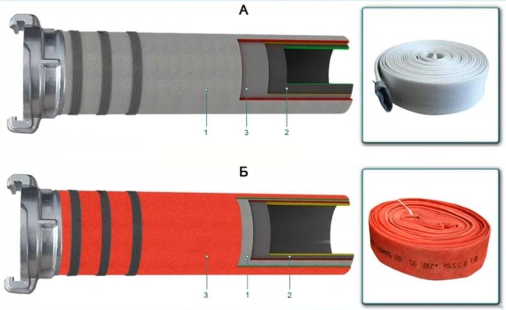 Напорный рукав рассчитан на работу под высоким давлением и комплектуется стволом. На стенки каркаса приходится нагрузка до 10 кг/см2, поэтому его основу составляют несколько слоев полимерных нитей. Чаще всего применяют капрон или лавсан, но иногда используют и натуральные материалы: джут, пеньку, лен или хлопок. Нити делятся на продольные и поперечные.
