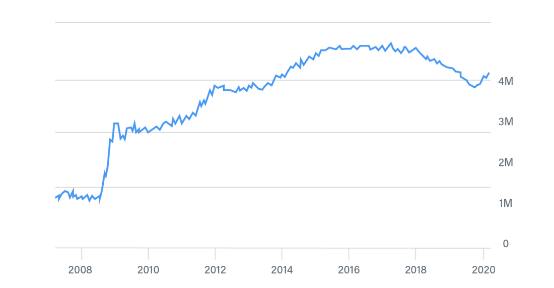 Как можно видеть, с начала количественного смягчения баланс ФРС быстро увеличивался. До количественного смягчения он составлял $900 млрд, а сегодня достиг $4 трлн. Разность между этими значениями – это ликвидность (т. е. денежная масса), которая была влита в экономику.