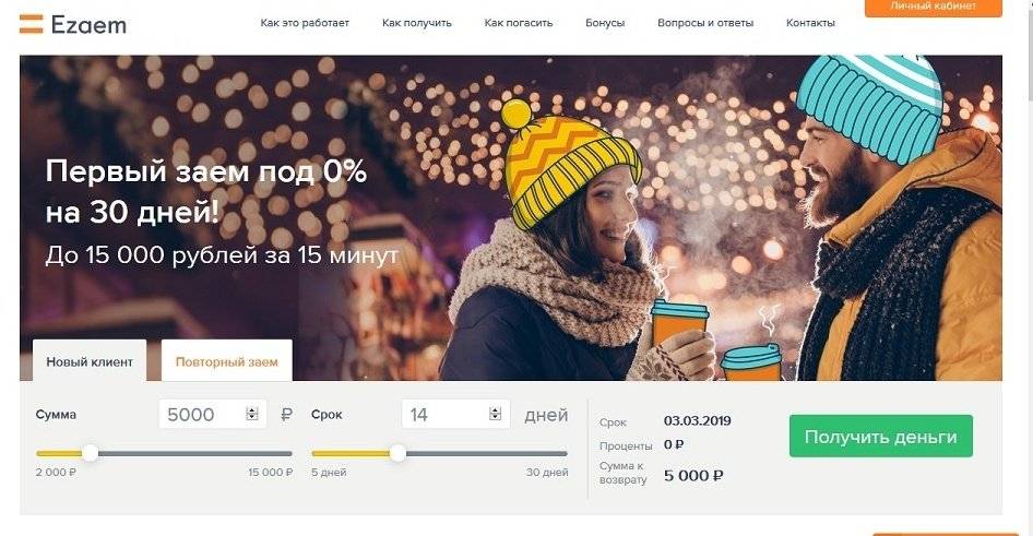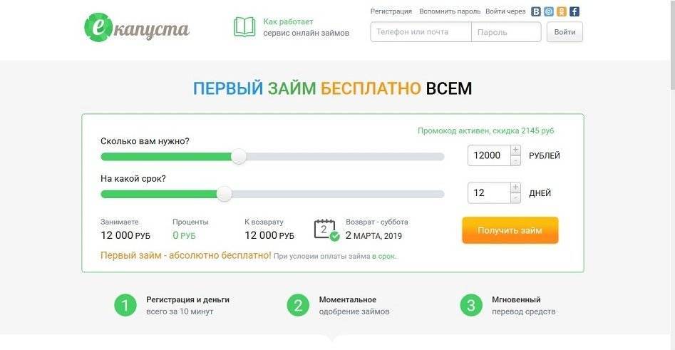 Также есть акция на первый займ сроком более 15 дней – начисление 0% за пользование.