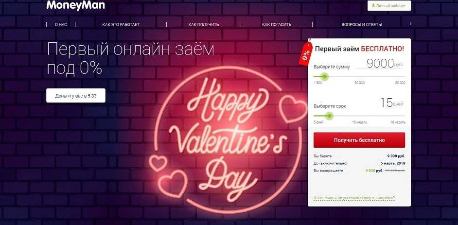 На сайте MoneyMan единственные требования, указанные к заёмщику – российское гражданство и совершеннолетний возраст. Займы на сумму от 1500 до 80000 рублей выдаются на сок от 5 дней до 18 недель. Сумма от 30000 рублей выдаётся не менее, чем на 10 недель.