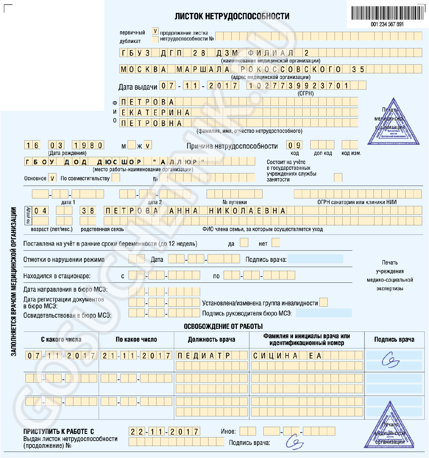 При одновременном уходе более чем за двумя детьми, когда выдается второй листок нетрудоспособности, в первом и втором ряду ячеек подраздела «По уходу» указывается возраст, родственная связь, фамилия, имя, отчество других детей, за которыми осуществляется уход, остальные строки (графы) листка нетрудоспособности оформляются идентично строкам (графам) первого листка нетрудоспособности.