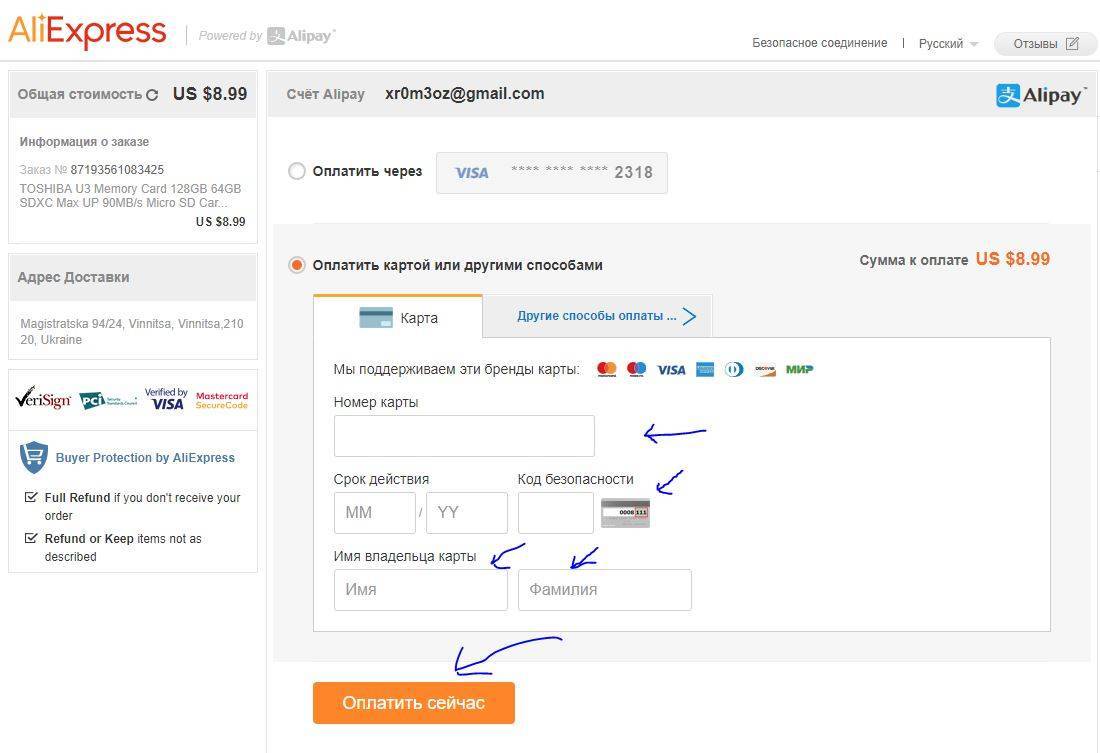Для начала оплаты приготовьте карту. Заполните данные в пункте «3» — способы оплаты. По умолчанию система Алиэкспресс выбирает оплату картой. Перенесите данные с карты в свободные поля формы, как на примере фото;