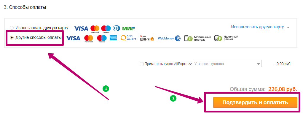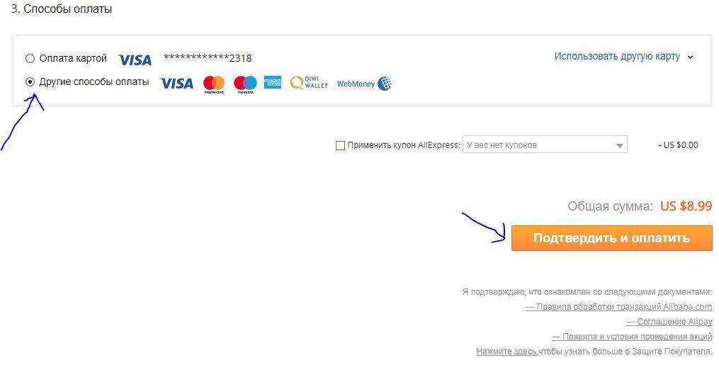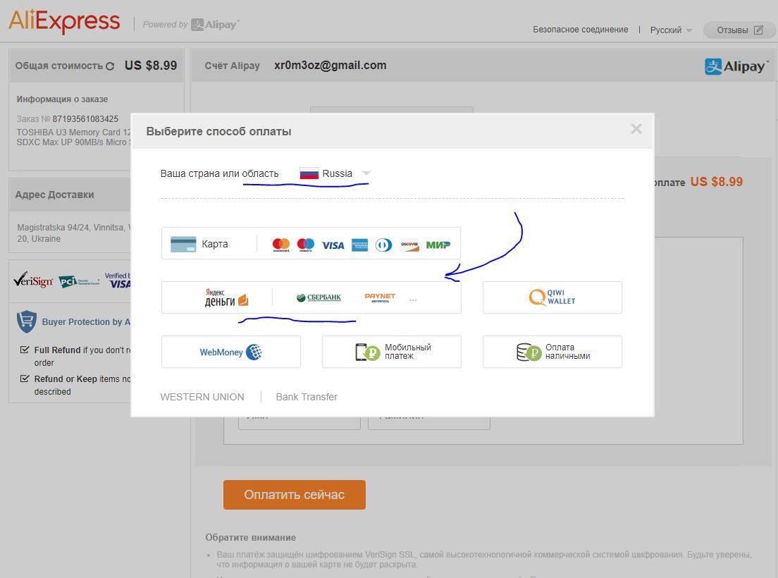 Для тех, кто совершает много приобретений — это действительно не очень удобно. Но, к счастью, на сервисе есть другие варианты (банковские карты, электронные счета и кошельки), поэтому можно легко совершать платежи, не отходя от компьютера или телефона. Инструкция по добавлению на Aliexpress способа оплаты наличными?