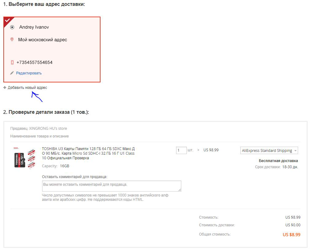- Убедитесь в правильности адреса доставки. При необходимости добавьте новый;