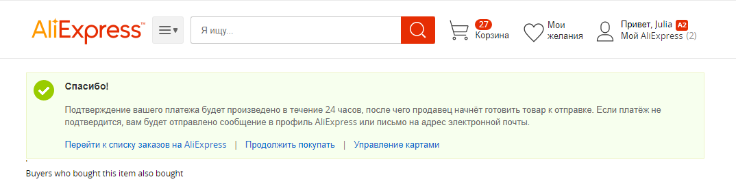 После успешной оплаты на следующей странице высветится окно, где будет сказано, что ваш платеж проверится в течение 24 часов, а после будет подготовлен продавцом к отправке.