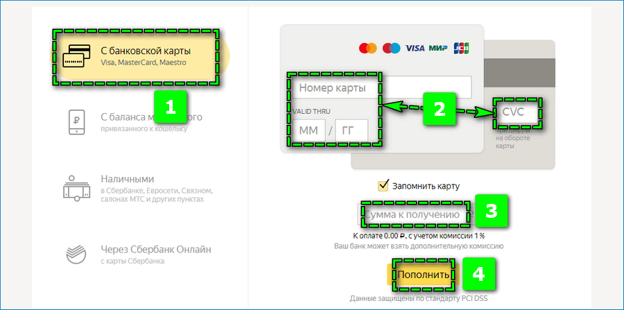 Здесь же можно привязать указанную карту, чтобы в дальнейшем использовать ее для вноса денег без необходимости повторного ввода реквизитов. Для этого установите галочку на «Запомнить карту».