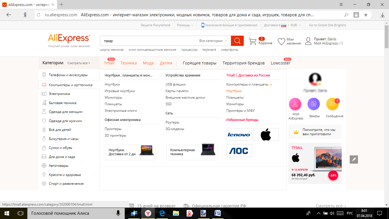 Более длительный и сложный способ – поиск по категориям, список которых расположен слева на Главной странице. Каждая из них имеет множество подкатегорий, перемещаясь между которыми можно в конце концов найти необходимый товар. Однако в большей степени такой способ подойдет тем, кто не знает, что конкретно хочет купить;