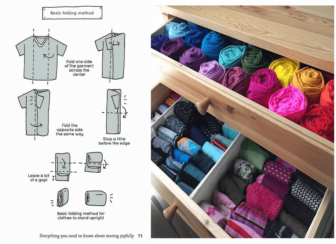 При сохранении прежнего порядка в ящиках и на полках в поисках понадобившейся вещи приходится перерыть и разворошить все остальное содержимое. Проблема решается раскладыванием по методу КонМари. Вещи, превращенные в прямоугольники, размещаются на полках вертикально по аналогии с хранением файлов в подставках.