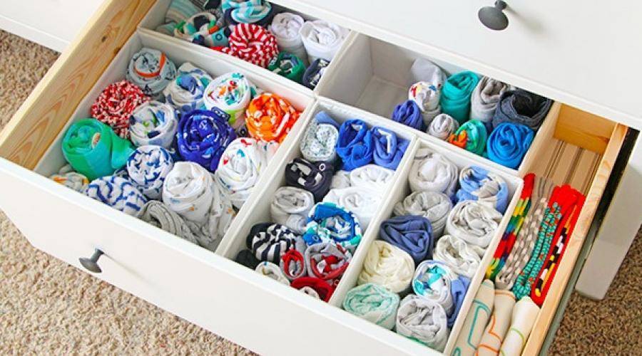 Совет! Экономно сложить вещи в шкафу поможет вертикальное хранение. Скрученный валик легко достать, не разрушая соседние ряды.