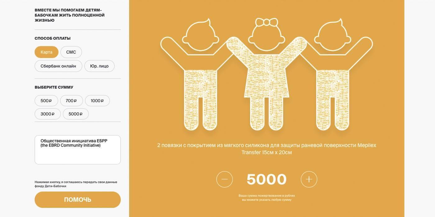 Страница «Помочь» на сайте фонда «Дети-бабочки»