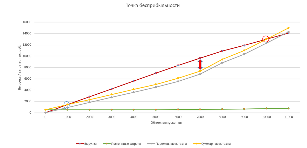 Точка безубыточности, которая рассчитывается в единицах измерения – показывает то количество продукции, которую продали. В данном случае доход от проданной продукции полностью покрывает все издержки, которые были потрачены на ее производство.