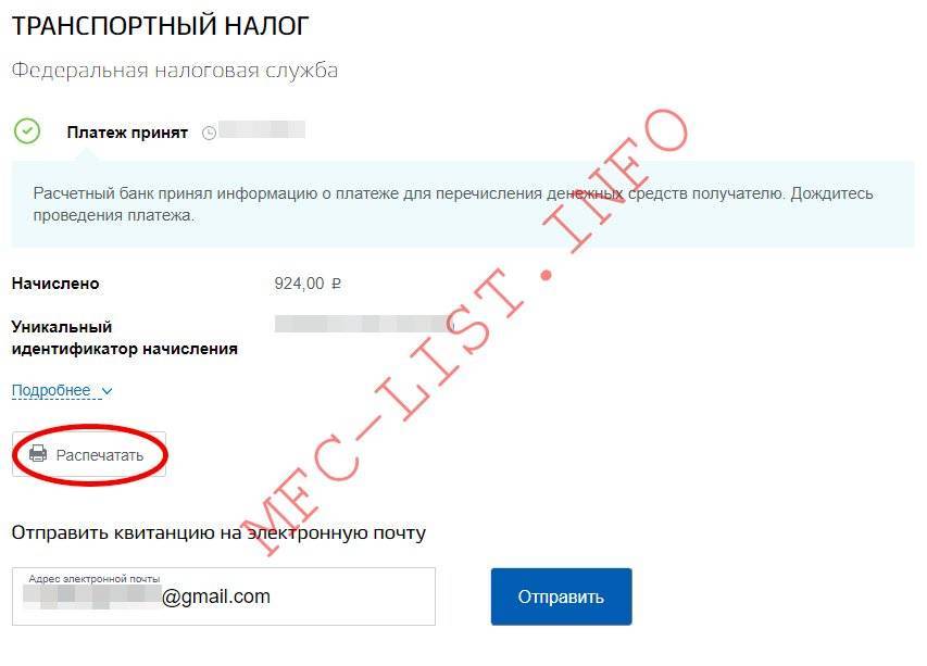 После подтверждения, деньги со счета отправятся в адрес налоговой службы, а Вы сможете распечатать квитанцию об оплате в личном кабинете налогоплательщика.