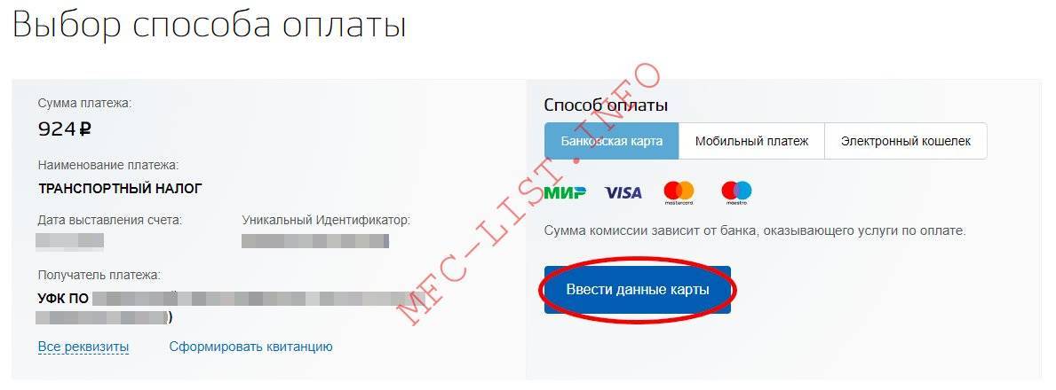 Шаг 4. Щелкнув по логотипу Госуслуг или другой организации, можно оплатить налог онлайн при помощи банковской карты в независимости банка эмитента и платежной системы MasterCard, Visa или Maestro.