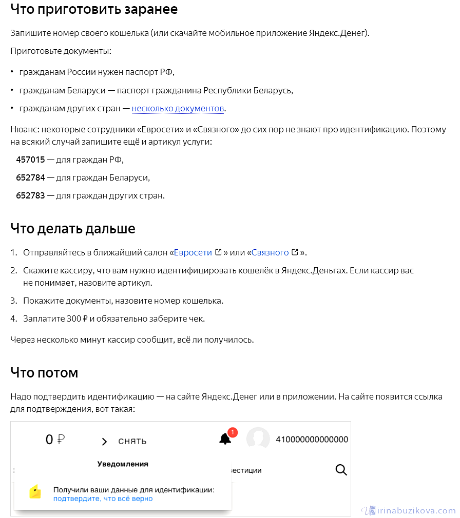Идентификация кошелька в Яндекс.Деньгах позволяет владельцу пользоваться всеми доступными способами для списания и зачисления средств, в том числе, через банковский перевод по номеру счета/карты, через систему Webmoney и т.д. Доступные лимиты для снятия и транзакций увеличиваются до 400 тыс. руб. единовременно и до 6 млн руб. в месяц. Получить идентифицированный статус кошелька не так просто, особенно если его владелец проживает в «глубинке». Система предоставляет несколько способов идентификации и самый простой из них — платеж в Евросети. Владельцу нужно скачать и распечатать в своем личном кабинете Яндекс.Денег специальное заявление, заполнить его и принести в любой салон связи «Евросеть», оплатить 50 руб. и подписать соответствующие бумаги. Аналогичную процедуру идентификации можно пройти и в офисах системы переводов Contact, но комиссия в этом случае будет 150 руб. Также заполненное заявление можно отправить заказным письмом по Почте России. Для этого придется заверить подпись у нотариуса и приложить к письму фото первых 2-х разворотов паспорта. Жителям Москвы, СПБ, Нижнего Новгорода, Новосибирска и Екатеринбурга можно прийти в офис Яндекса, предъявить паспорт и сообщить о своем желании идентифицировать кошелек.