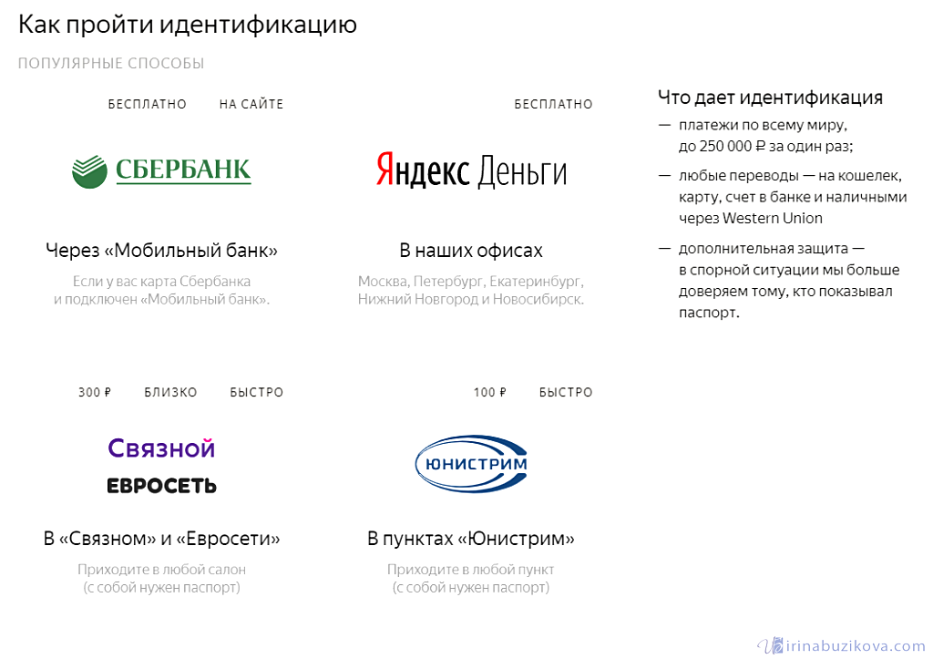 Этот способ доступен только идентифицированным пользователям. Чтобы пройти эту процедуру, достаточно выбрать один из доступных способов, описание которых можно найти на официальном сайте Яндекс.Деньги.
