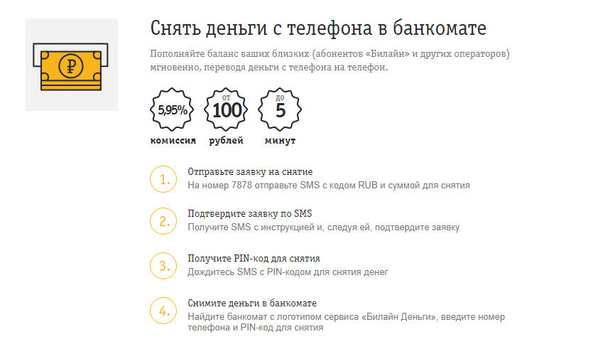 Снять деньги со своего счета Билайн представляется возможным через банкомат. Перевести деньги можно с официального сайта Билайн или при помощи SMS-сообщения. Максимальная сумма одной транзакции — 5000 рублей. В течение месяца можно снять с баланса не более 40 000 рублей. Минимальная сумма для снятия денег через банкомат — 100 рублей. После вывода средство на балансе телефона должно остаться не меньше 50 рублей. Комиссия за снятие денег со счета Билайн через банкомат составляет 5,95%. Получить наличные можно в течение нескольких минут, при условии наличия рядом банкомата.