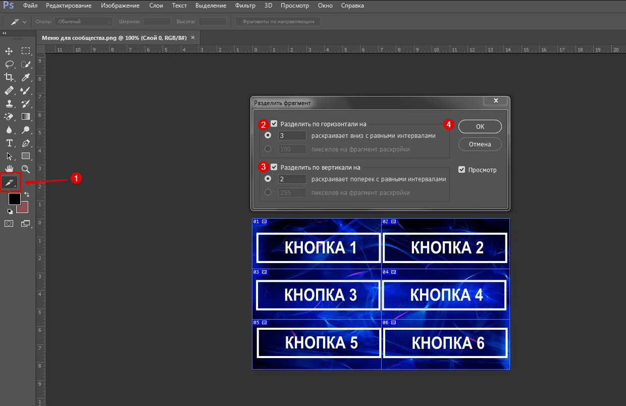- Режем эту картинку на 6 частей (по части на каждую кнопку). Это удобно делать в Adobe Photoshop инструментом «Раскройка». Если не хотите заморачиваться, воспользуйтесь, например, онлайн-сервисом IMGonline (режет картинки на равные части). Мы же сделали все в Photoshop.