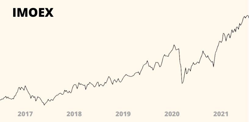 IMOEX – индекс, который отображает общую динамику крупнейших компаний России: СберБанка, Газпрома, Магнита, Сургутнефтегаза, Яндекса и других. В состав индекса входят 44 компании. За пять лет он вырос на 97%.