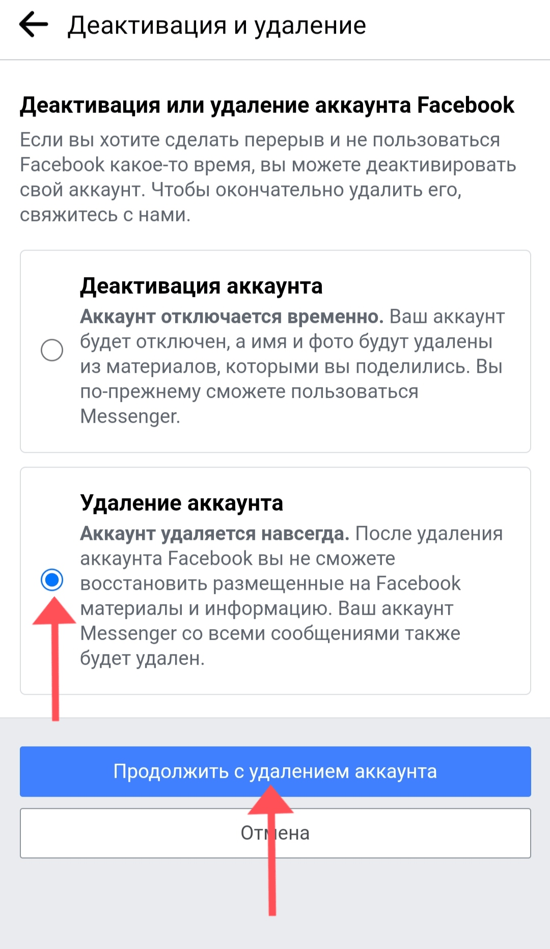 - Выберите опцию “Деактивация аккаунта” или “Удаление аккаунта”, затем подтвердите действие, нажав “Продолжить с удалением аккаунта”.