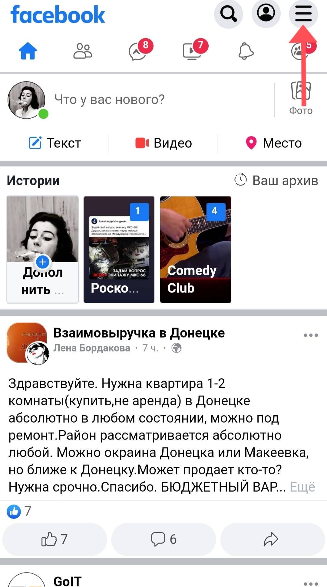 - Зайдите в приложение Facebook и нажмите на кнопку меню (вверху приложения, три горизонтальных полоски).
