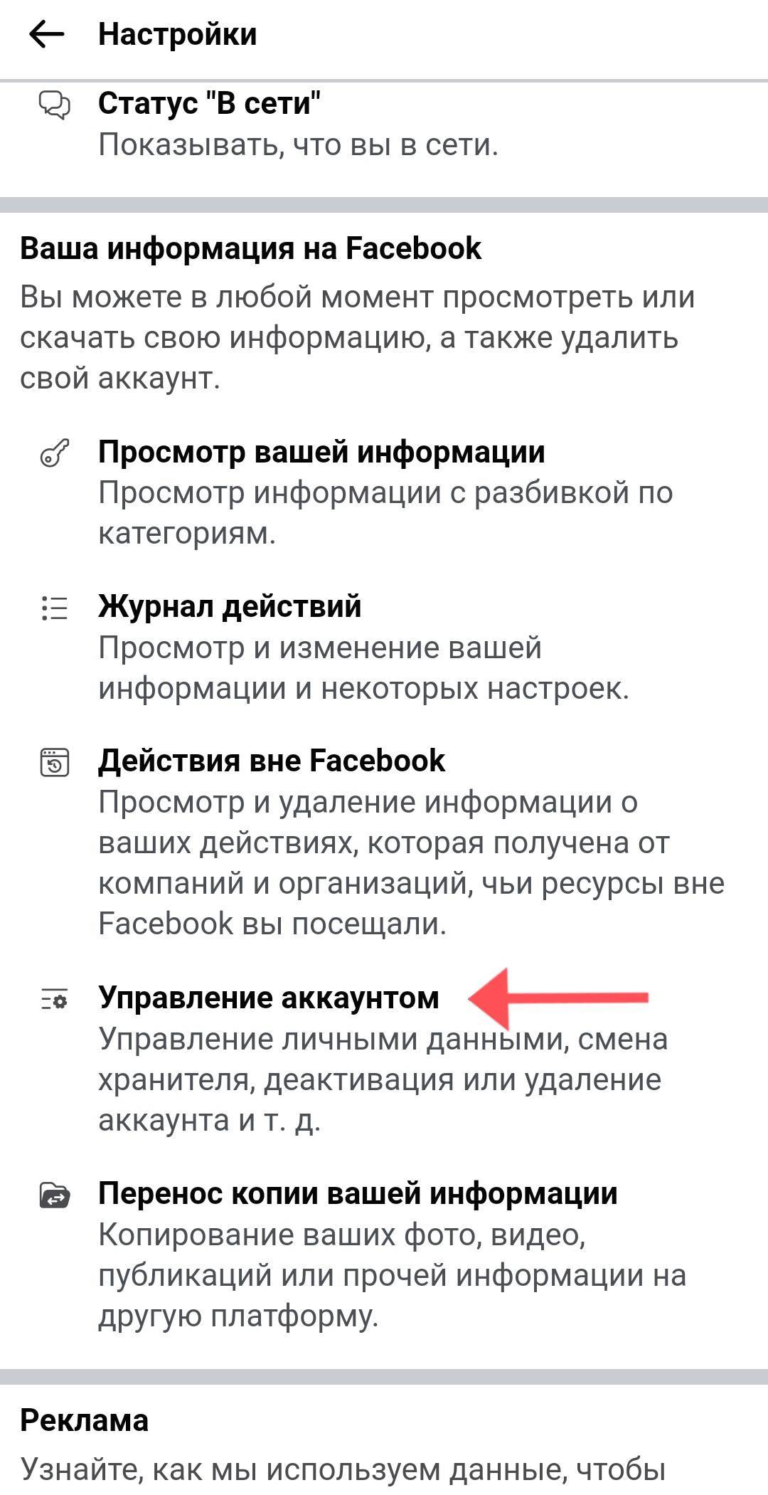 4. Прокрутим вниз и найдем «Управление» — раздел «Ваша информация на Фейсбук»;