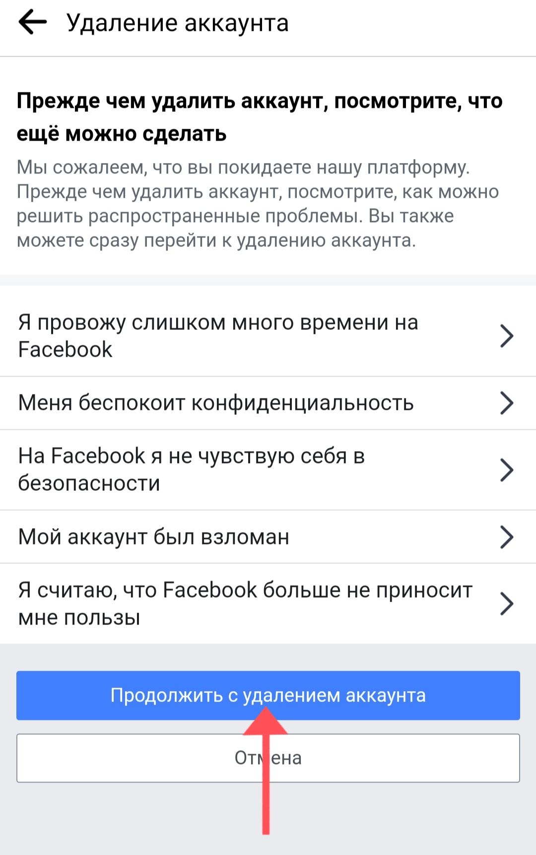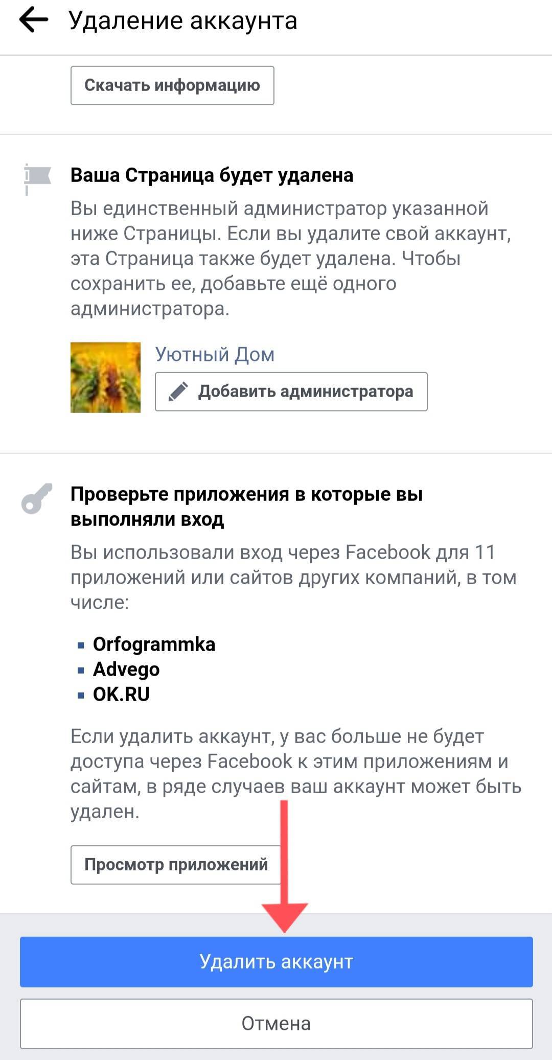 Инструкция, как удалить страницу в Фейсбук навсегда с телефона в мобильном приложении: