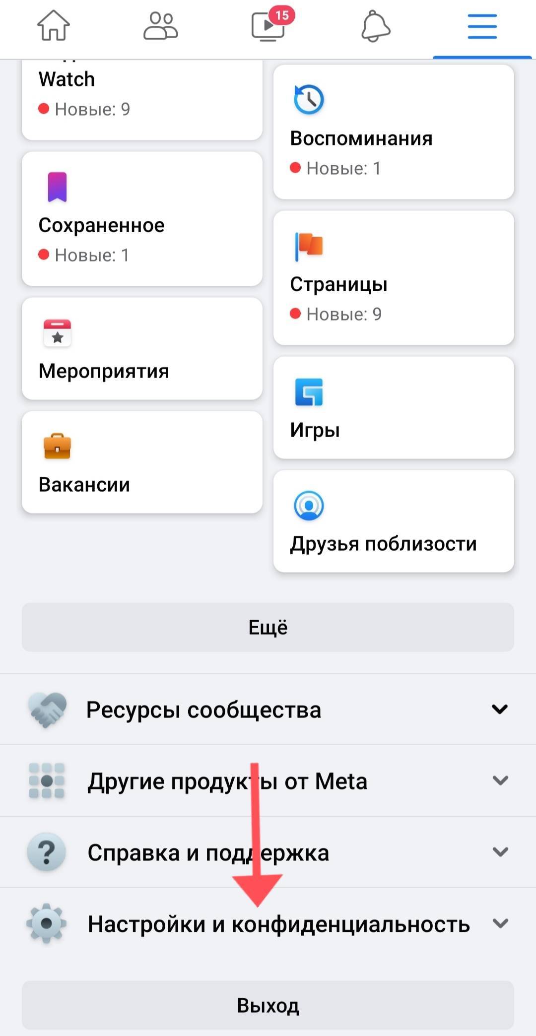 В открывшемся окне выберите пункт «Настройки и конфиденциальность». Экран необходимо пролистать вниз — в верхней части этот раздел не отображается.