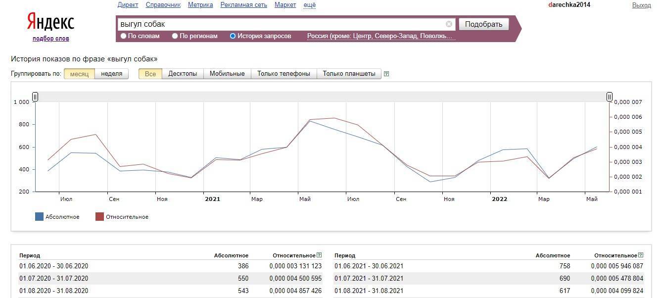 Оценить динамику спроса можно тоже в «Вордстате». Нажимаете на вкладку «История запросов» и видите, как меняется спрос в течение года.