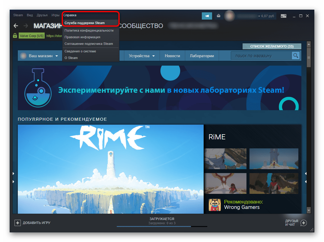- В Steam перейдите в меню Справка -> Служба поддержки Steam.