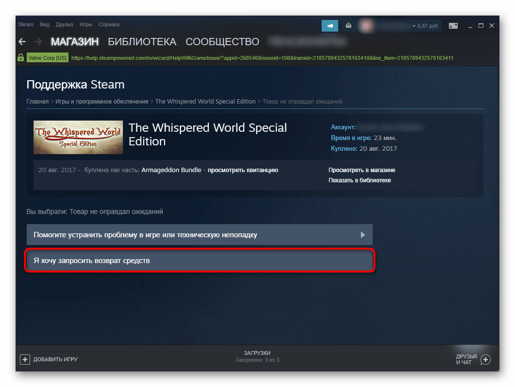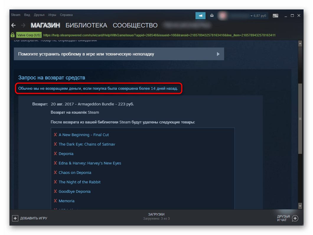Условия и сроки рассмотрения заявки на откат сделки покупки игры в Steam