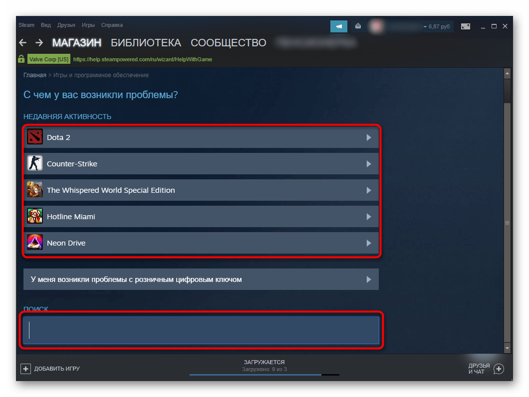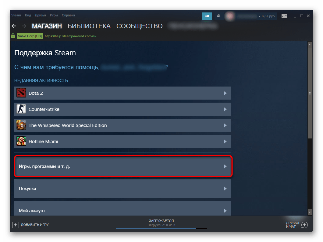 - В графе «Недавняя активность» может отобразиться необходимая игра. Если этого не произошло, найдите ниже пункт «Игры, программы и т. д.» либо «Покупки». В первом варианте необходимо ввести название игры и кликнуть по результату, во втором будет открыт список игр, купленных за последние 6 месяцев.