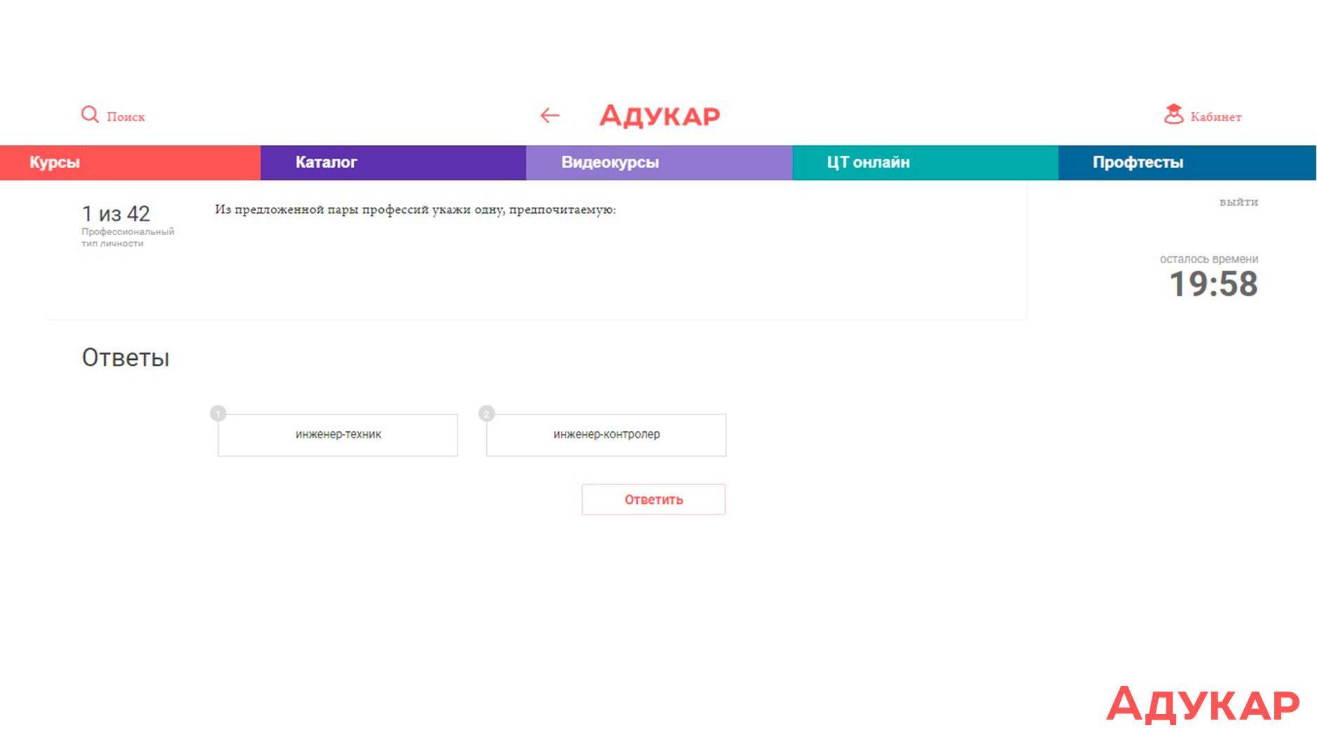 Тест на профессиональный тип личности Дж. Голланда (Холланда) можно пройти онлайн бесплатно на сайте Адукар в разделе «Профтесты». Всего в методике 42 вопроса, на ответ даётся 20 минут. Хоть в быстром темпе можно справиться и за четыре, но советуем проходить тест вдумчиво, чтобы результат был более точным. В итоге ты получишь полное описание своего типа личности и список специальностей ссузов и вузов, которые тебе подходят.