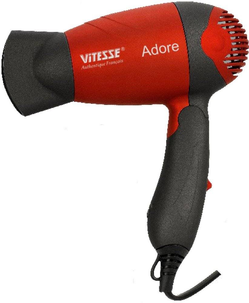 Очень удобная модель фена со складной ручкой, что позволяет его использовать не только дома, но и брать с собой в поездки. Керамика, входящая в состав корпуса изделия, обеспечивает ему качественную теплоизоляцию. Встроенная функция ионизации дает возможность сохранить структуру волосяного покрова, а также сделать его гладким, блестящим и послушным. Работает устройство в 2-х режимах скоростей. Дополнительным функционалом Vitesse VS-930 является наличие защитной функции от перегрева, которая автоматически отключает аппарат при достижении им температуры, превышающей максимальную. Мощность этой модели составляет 1200 Вт. Из дополнительных деталей, входящих в комплектацию фена, является навесная петля для удобства его хранения после окончания работы.