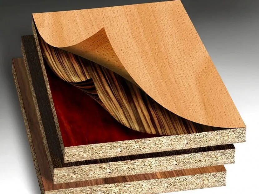 К поверхности плиты приклеивают тонкий лист из натурального дерева. Шпон толщиной в 3 мм создают на специальном лущильном станке. Материал полностью повторяет природный рисунок сырья, из которого сделан. Покрытие дополнительно увеличивает показатели прочности, устойчивости к механическим повреждениям.