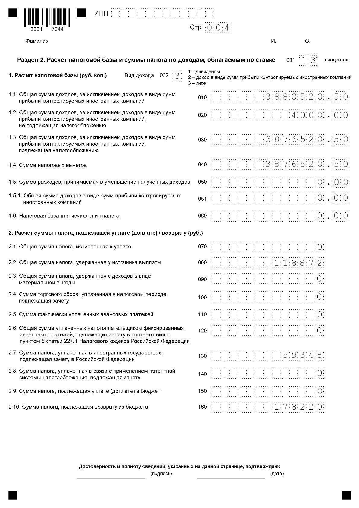 Переходим к заполнению страницы 3 раздел 2 — расчет налоговой базы по ставке подоходного налога.