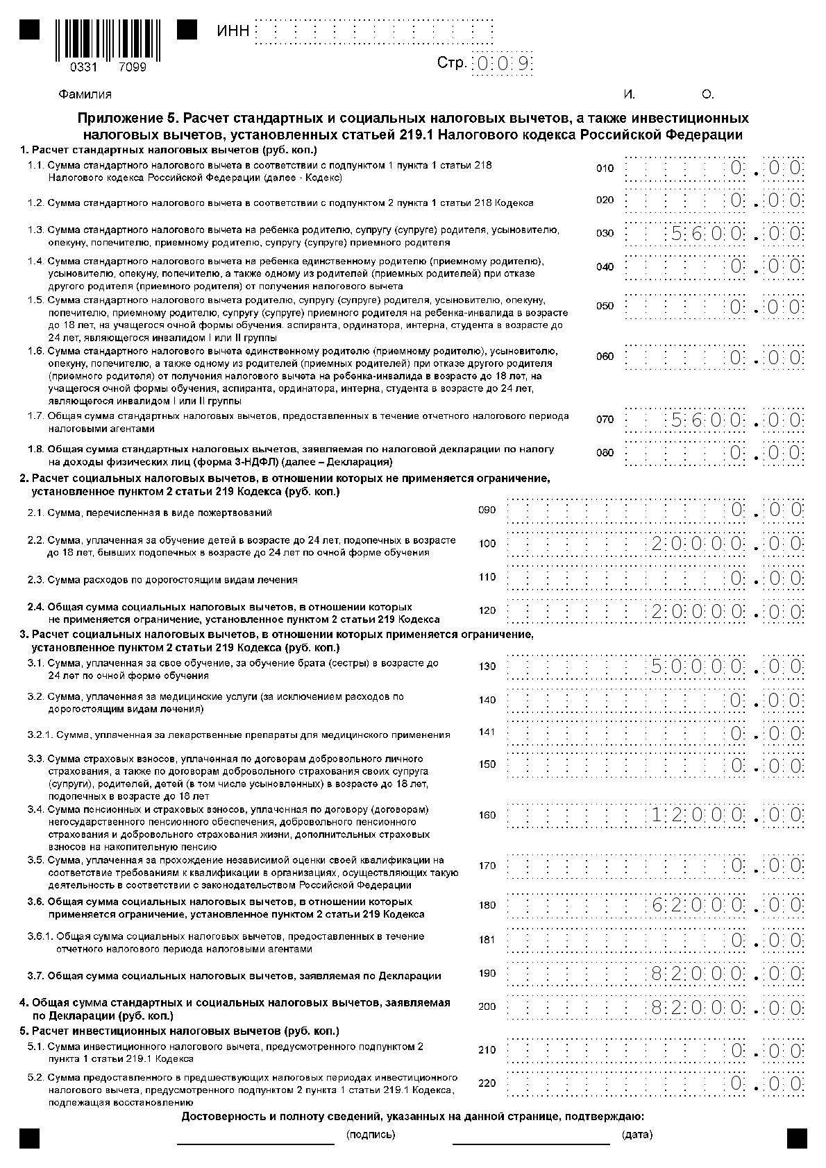 Приложение 5. Расчет стандартных и социальных налоговых вычетов, а также инвестиционных налоговых вычетов, установленных статьей 219.1 Налогового кодекса Российской Федерации