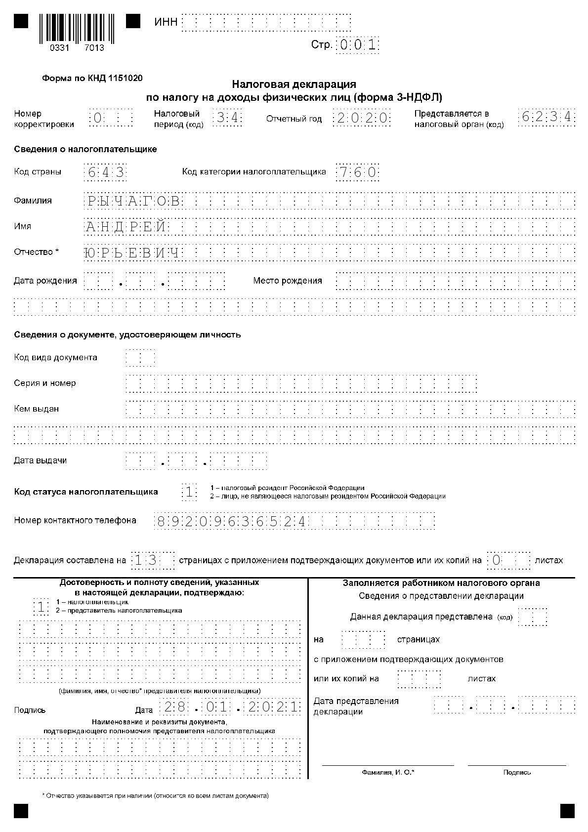 Образец заполнения формы 3-НДФЛ: