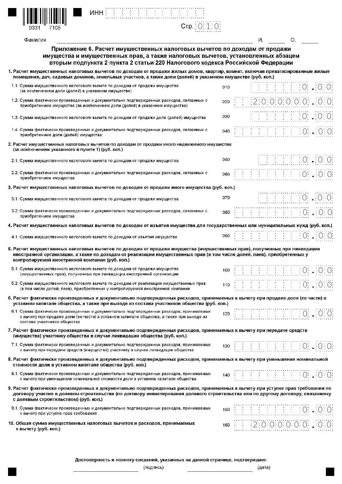Переходят к приложению 6, где указывают все налоговые вычеты, на которые рассчитывает налогоплательщик. Если у гражданина есть документы, подтверждающие расходы на проданное имущество, то он заполняет поле 020, а если их нет — строку 010. Если на другие вычеты налогоплательщик не претендует, то указанное в графах 020 или 010 значение переносится в поле 160.