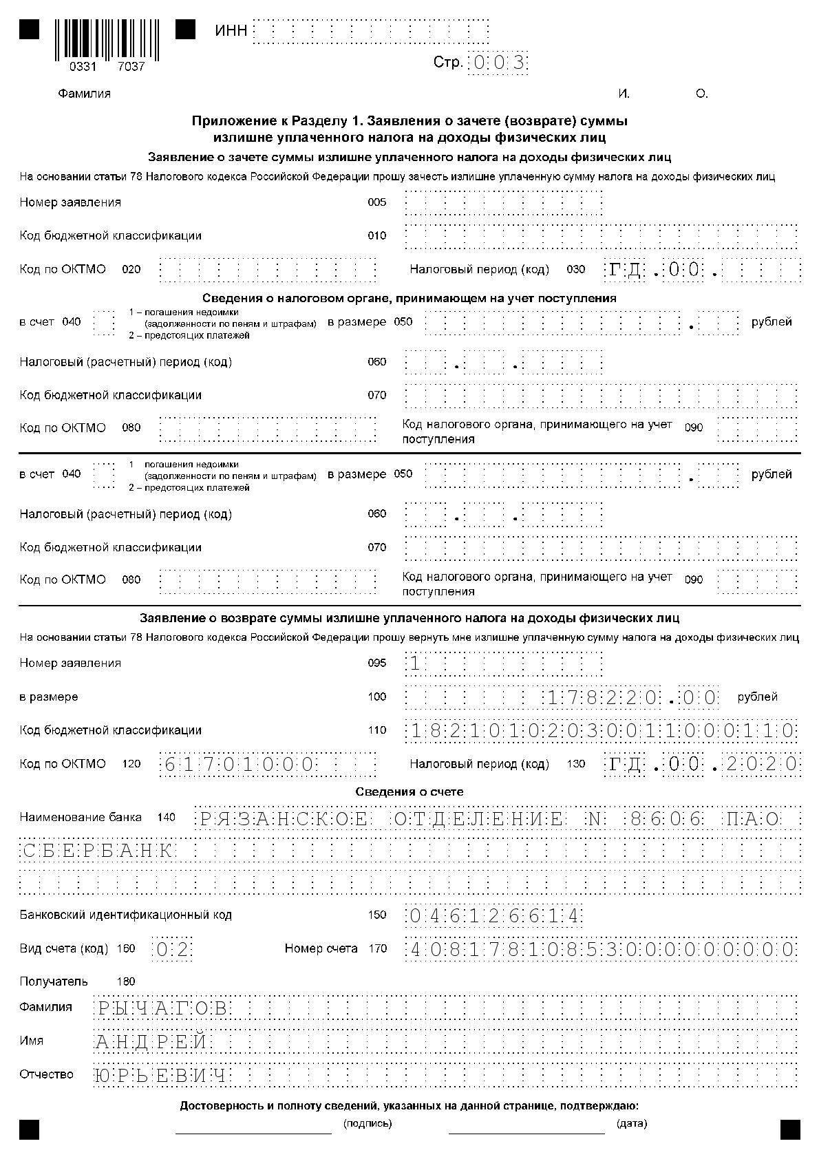 Приложение к Разделу 1. Заявление о зачете (возврате) суммы излишние уплаченного налога на доходы физических лиц
