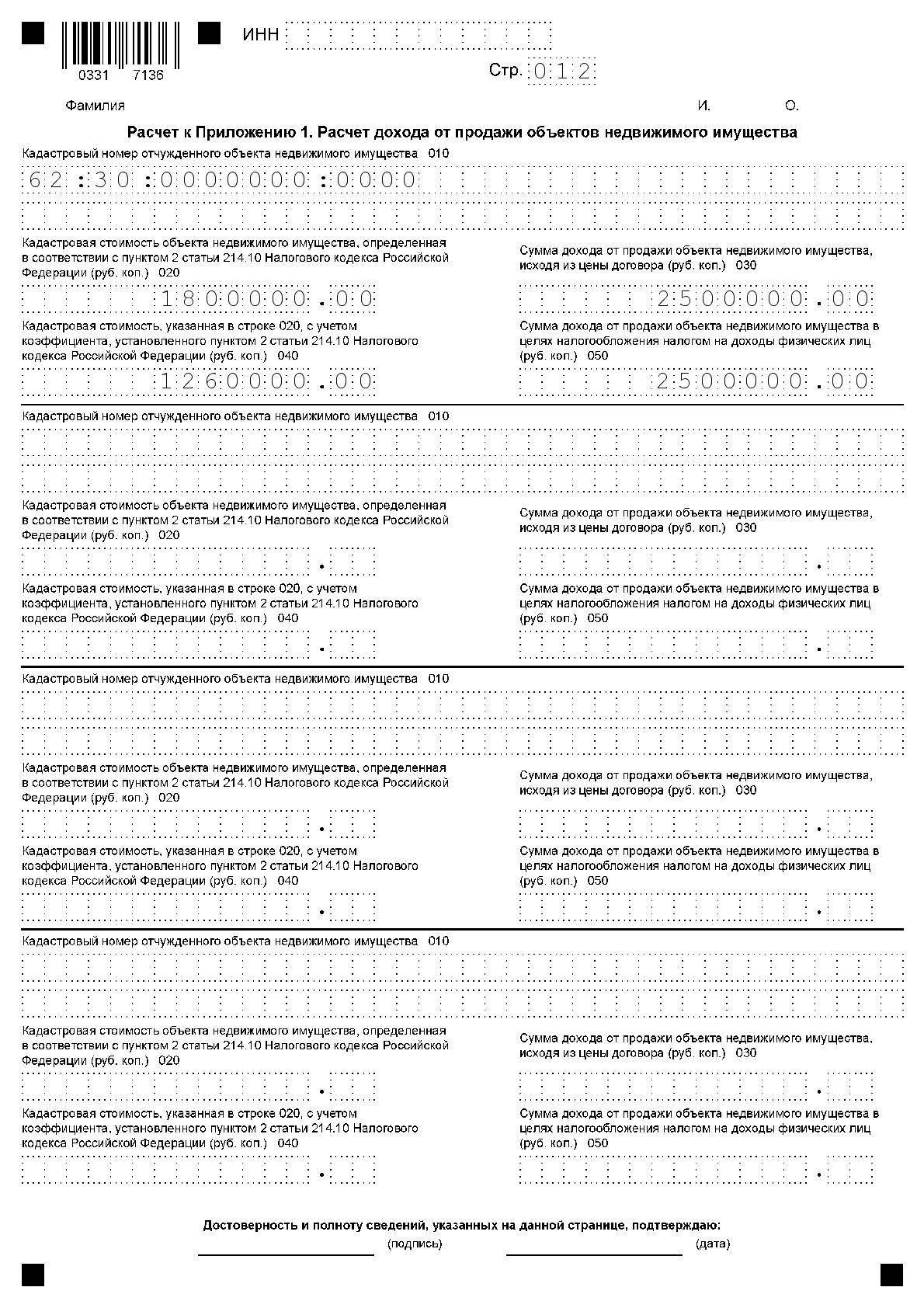 Приложение 1 начинается с ИНН, фамилии и инициалов налогоплательщика. Затем вписывают: