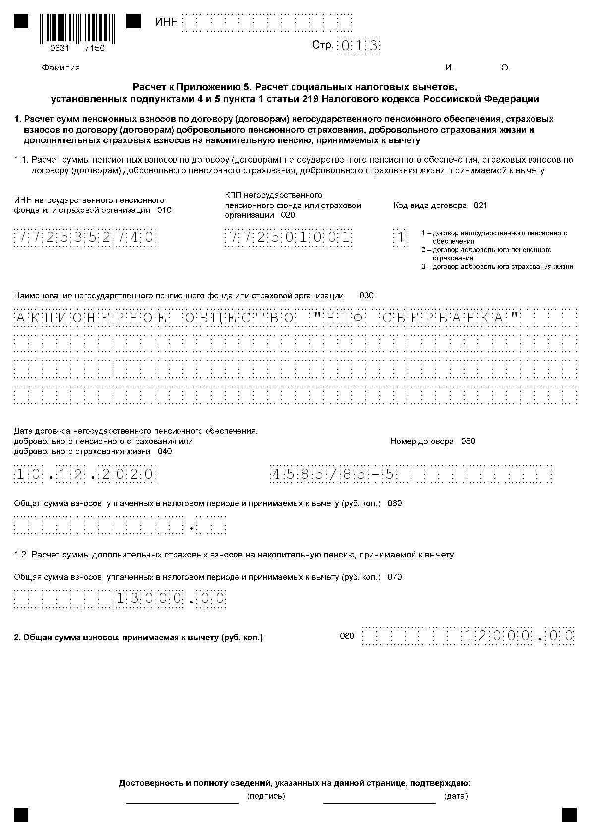 10 декабря 2020 года Андрей Юрьевич заключил договор негосударственного пенсионного обеспечения с АО “НПФ СБЕРБАНКА”, общая сумма взносов, уплаченных в 2020 году по данному договору, составила 12 тыс. руб.