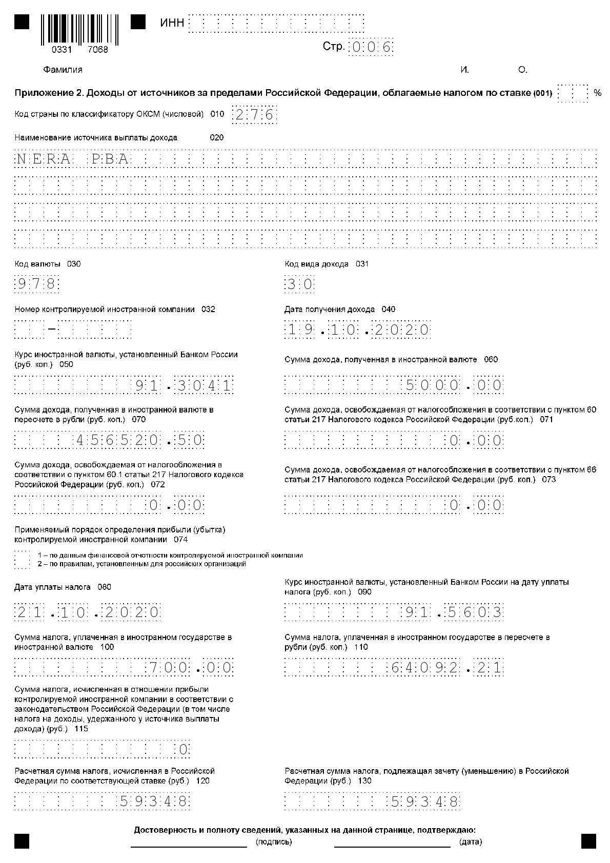Приложение 2. Доходы от источников за пределами Российской Федерации, облагаемые налогом по ставке (001)