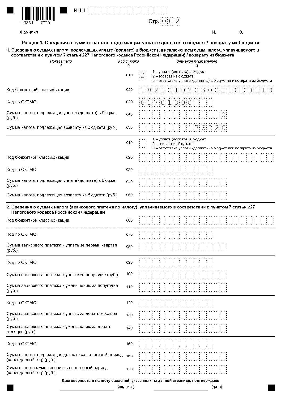 Образец заполнения раздела 2 бланка 3-НДФЛ
