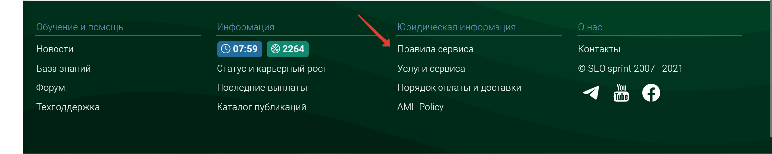 Чтобы подробно ознакомиться с правилами сервиса, надо спуститься вниз сайта в “подвал” в нижнее меню.