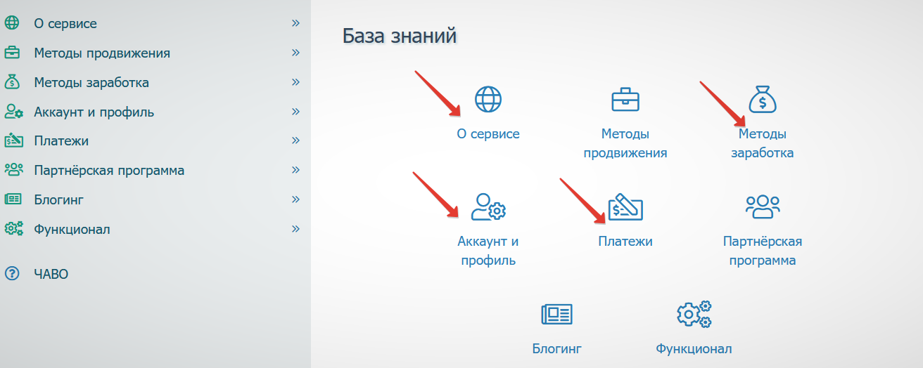 Здесь же можно зайти в раздел “База знаний“, которая, на мой взгляд, наиболее емкая и полезная. Пока нас интересуют только несколько разделов: