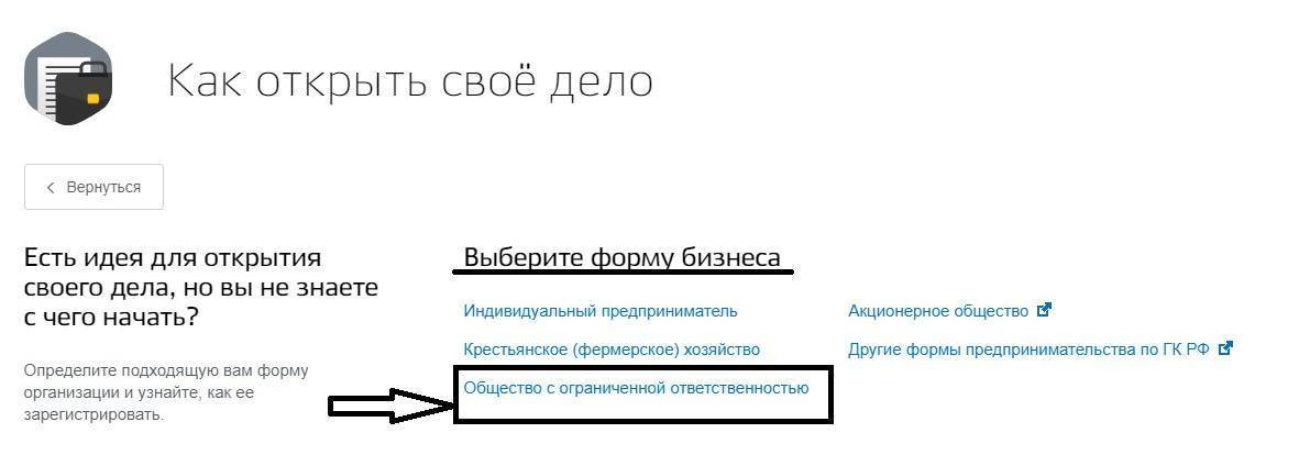Шаг 3. В открывшемся окне необходимо выбрать категорию бизнеса. Для регистрации ООО необходимо перейти в раздел «Общество с ограниченной ответственностью».