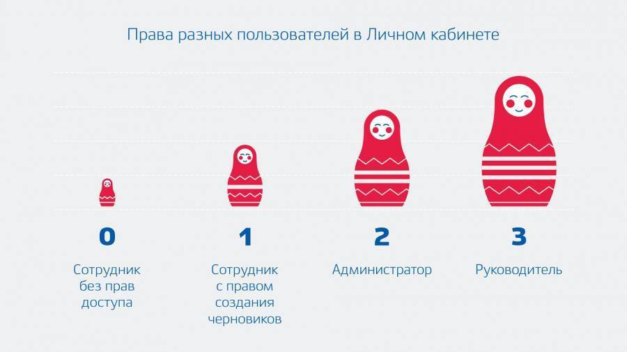 К «Личному кабинету» ИП или юрлица может присоединиться пользователь с подтвержденной учетной записью на портале «Госуслуги». Приглашения же можно отправлять и незарегистрированным на портале сотрудникам. Они присоединятся к «Личному кабинету» после регистрации и подтверждения учетной записи.