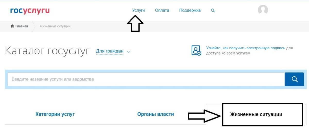 Шаг 2. Затем необходимо выбрать категорию «Услуги». После этого зайти в раздел «Жизненные ситуации».