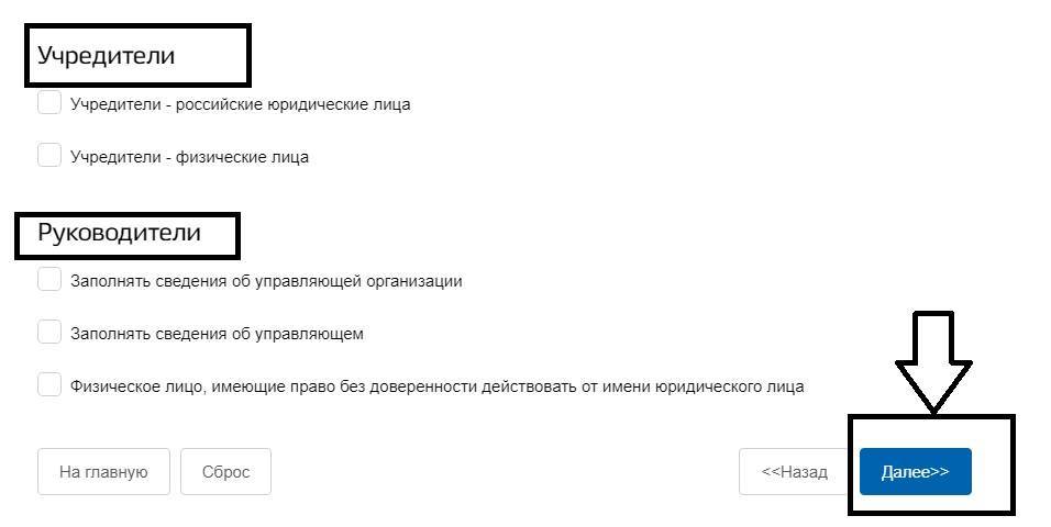 Шаг 6. Затем необходимо заполнить заявление. Для этого заявитель должен указать контактную информацию, учредителей и руководителей. После этого нажать на кнопку «Далее».